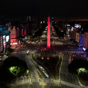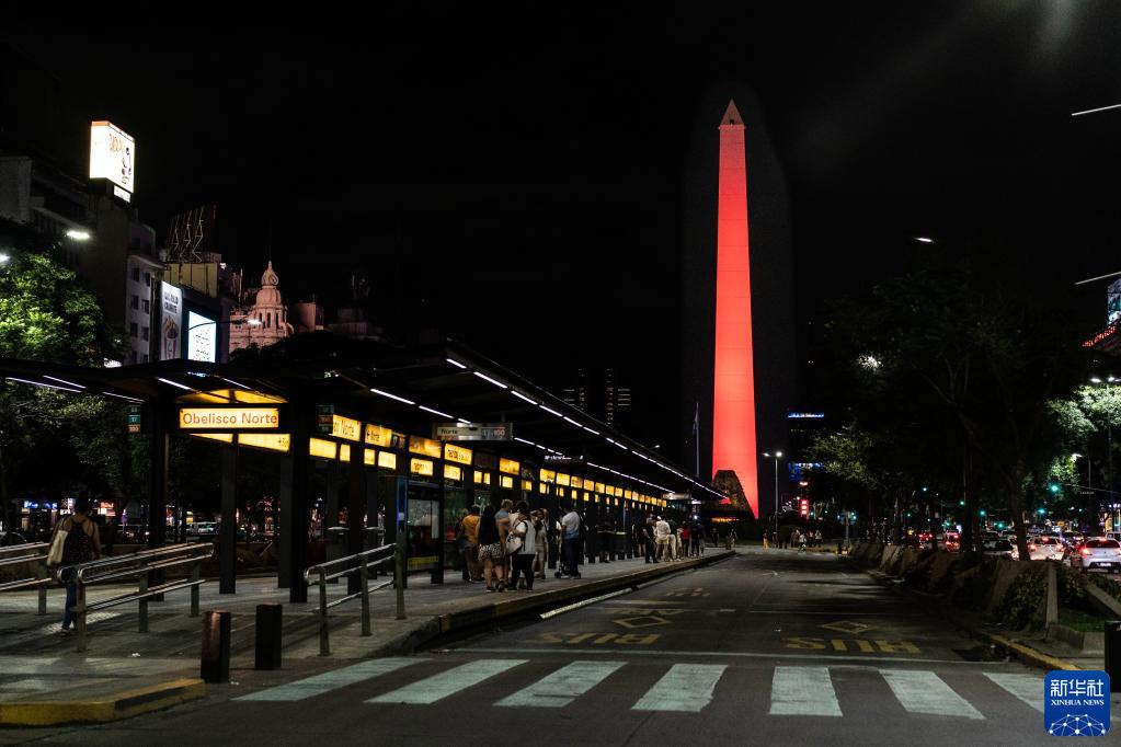 1月22日,阿根廷首都布宜諾斯艾利斯市中心的地標性建筑方尖碑點亮“中國紅”,慶祝中國春節。