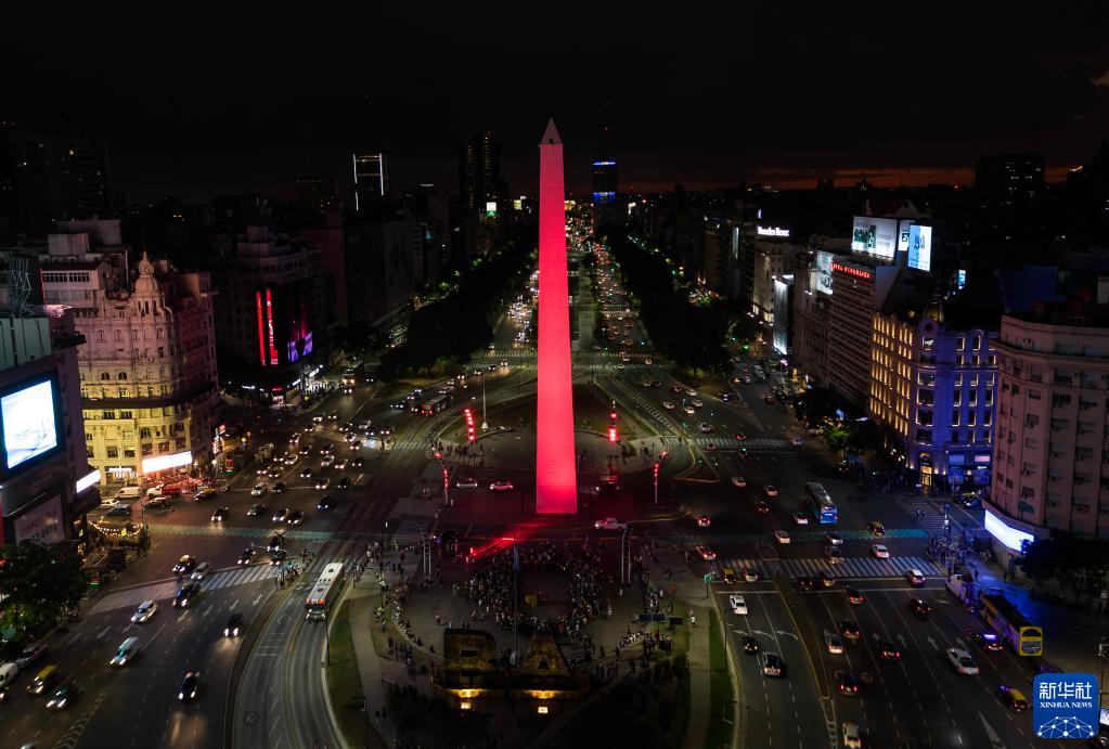1月22日,阿根廷首都布宜諾斯艾利斯市中心的地標性建筑方尖碑點亮“中國紅”,慶祝中國春節(無人機照片)。