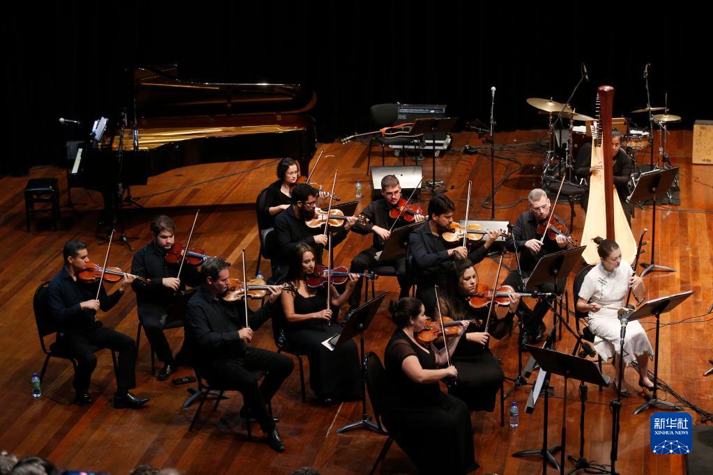 1月21日晚,在巴西首都巴西利亞普利尼奧·馬科斯劇院,中國民樂演奏家與巴西利亞室內樂團的音樂家們在2023年“歡樂春節”音樂會上演奏樂曲。