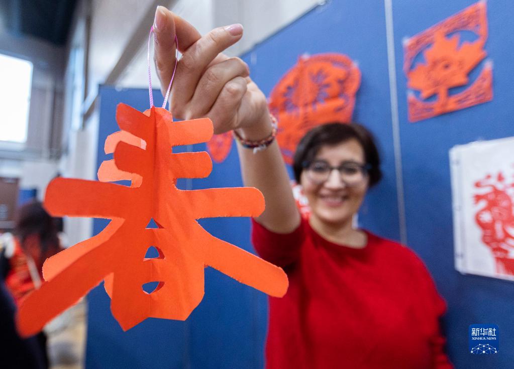 1月22日,在加拿大多倫多,一名女子在春節“廟會”上展示自己的剪紙作品。