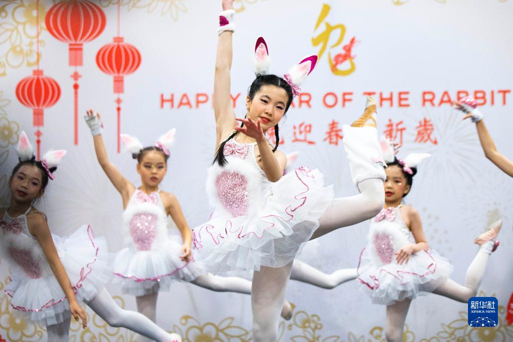 1月22日,在加拿大多倫多,扮作兔子的兒童在春節“廟會”上表演舞蹈。
