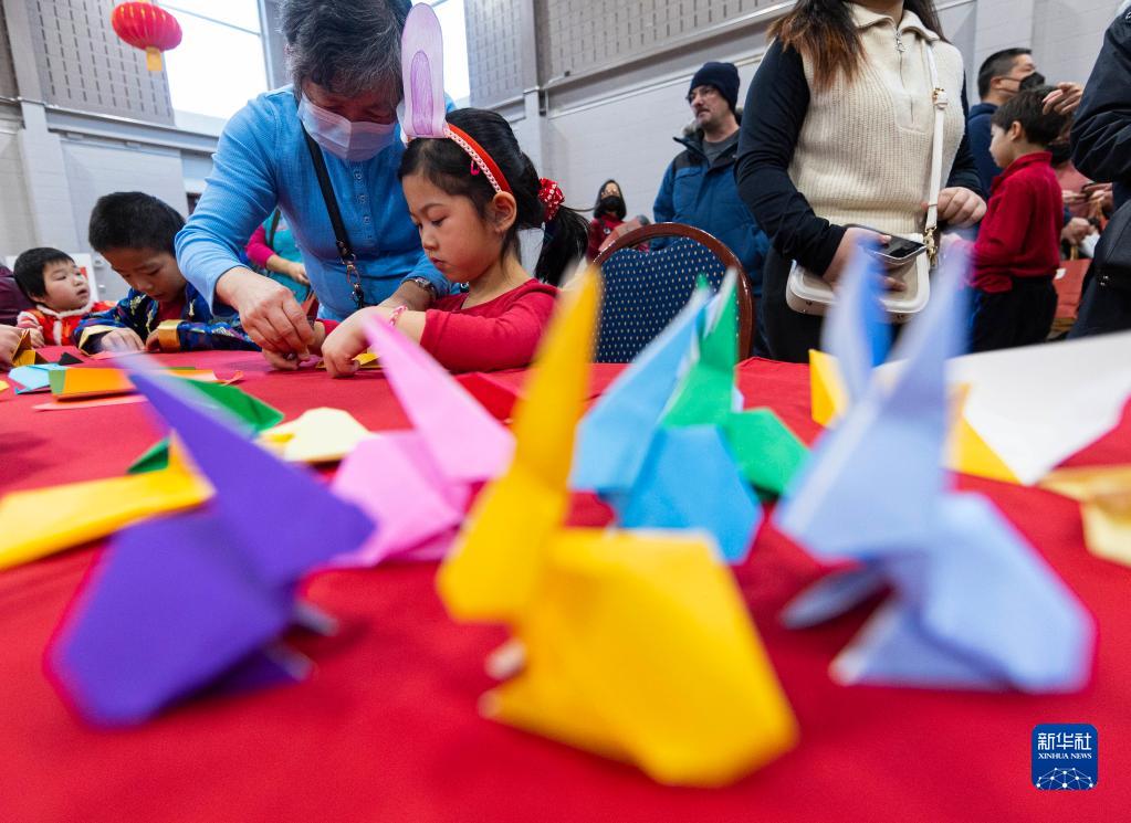 1月22日,在加拿大多倫多,一名女孩與奶奶在春節“廟會”上學習折紙。