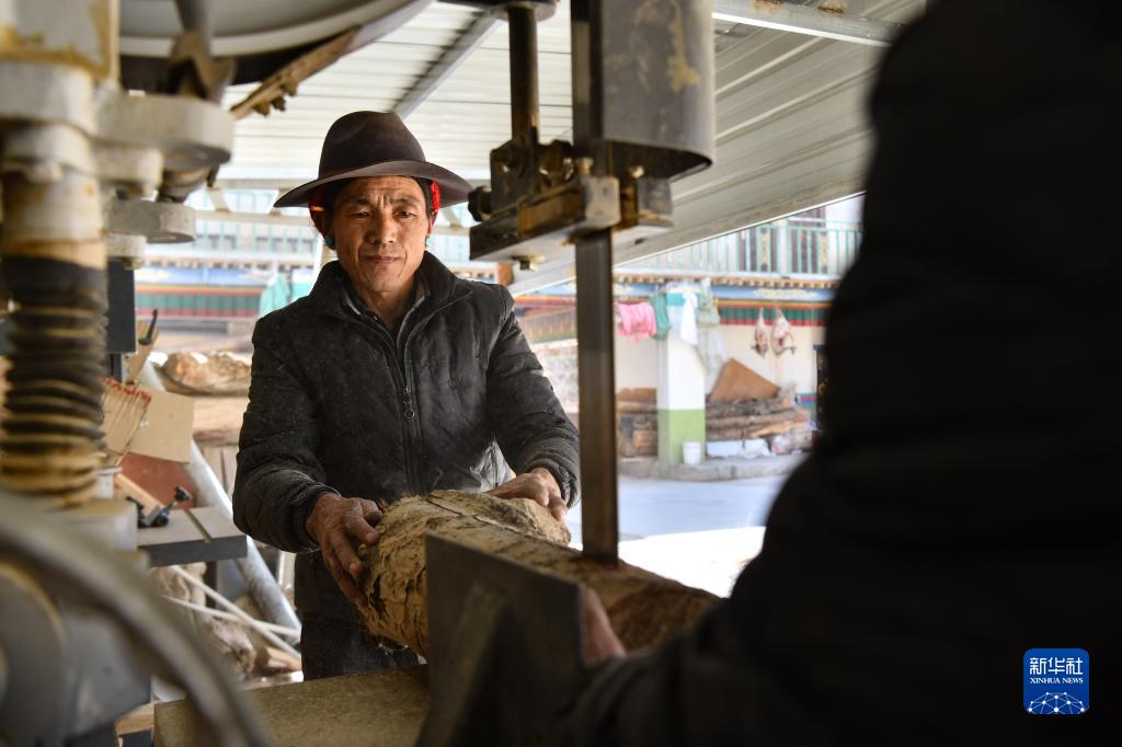 索朗瓊拉在切割制作扎念琴的木材原料(1月19日攝)。