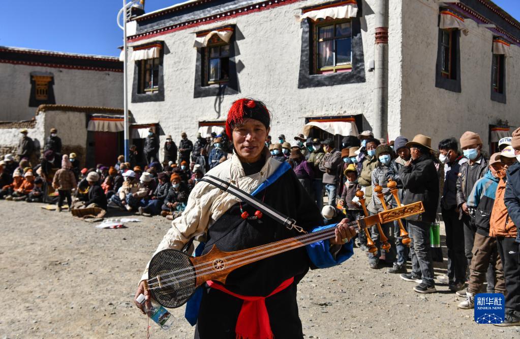 在西藏日喀則市芒普鄉普村的“村晚”現場,演員手持扎念琴準備表演傳統節目(1月21日攝)。