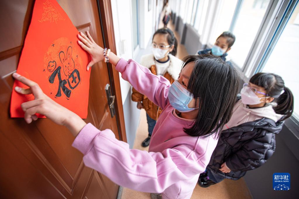 在浙江省溫嶺市大溪小學,學生們在貼兔年創意福字(1月17日攝)。