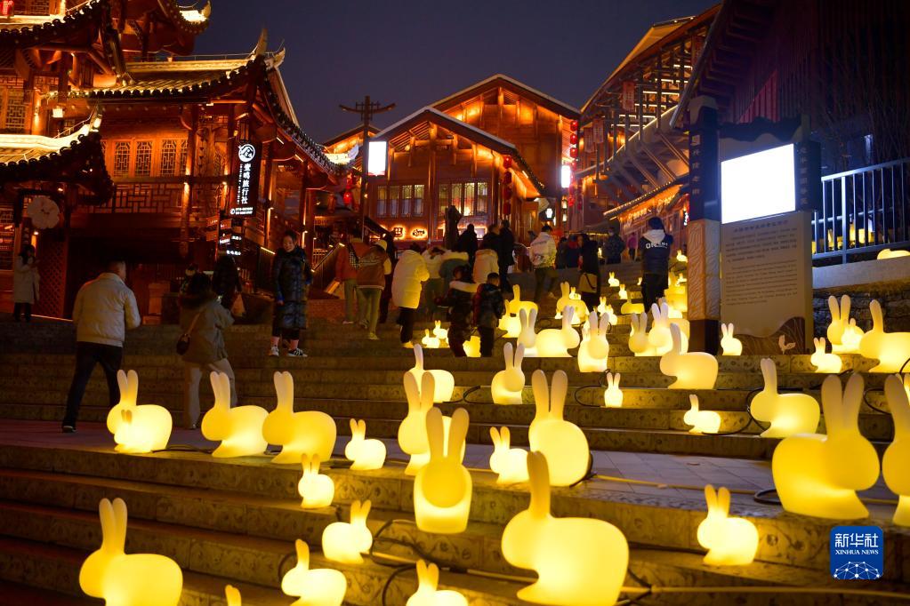 人們在湖北省恩施土家族苗族自治州宣恩縣城貢水河畔觀看兔燈(1月22日攝)。