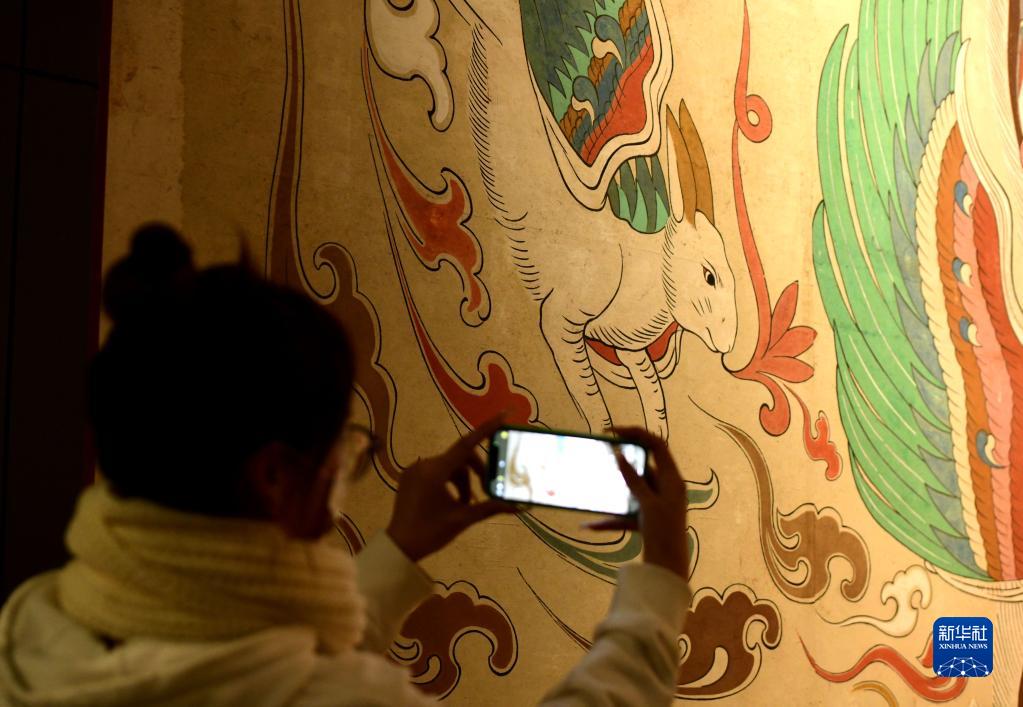 市民在河北博物院壁畫展廳拍攝壁畫中的羽兔(1月23日攝)。