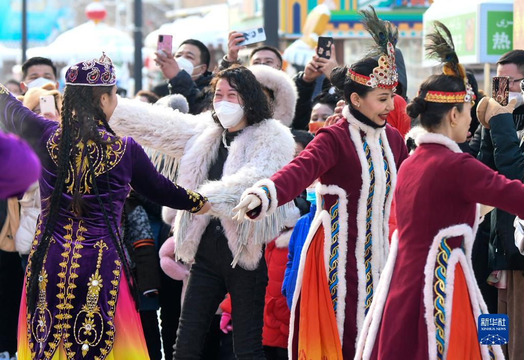 1月23日,在烏魯木齊大巴扎景區,游客和演員一起跳起歡快的麥西來甫。