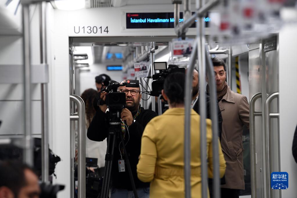 1月22日,在土耳其伊斯坦布爾,媒體記者在伊斯坦布爾新機場線地鐵列車內采訪。