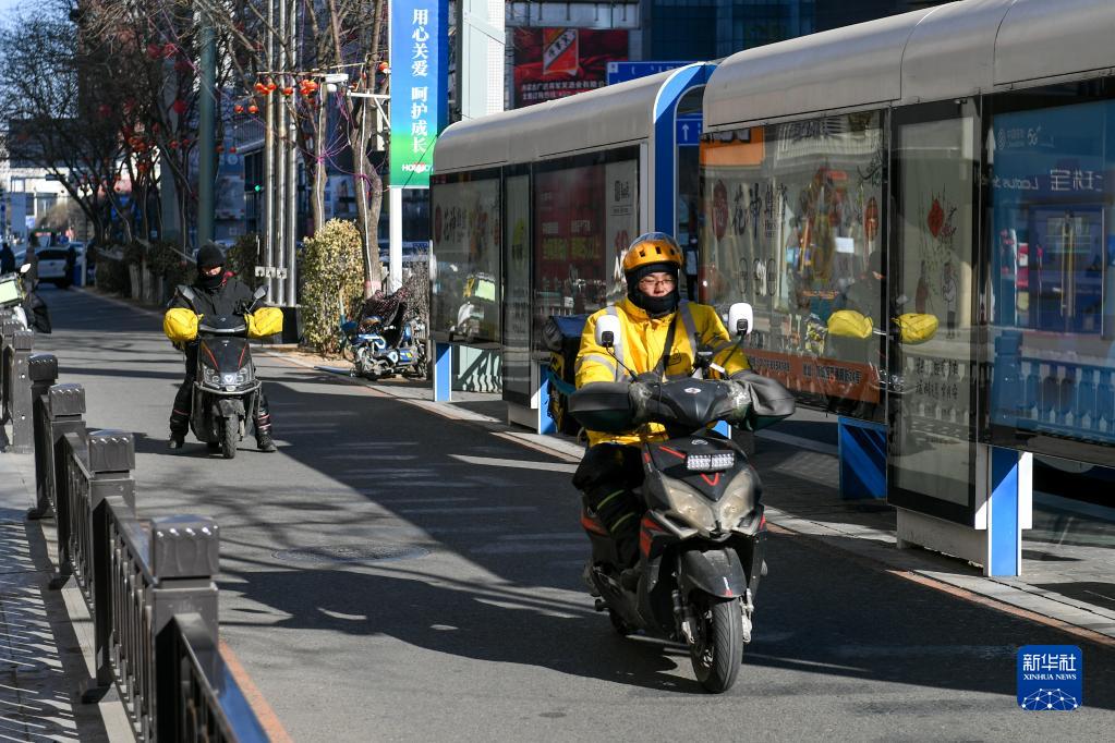 1月23日,一名外賣騎手在內蒙古呼和浩特市中山西路騎行。
