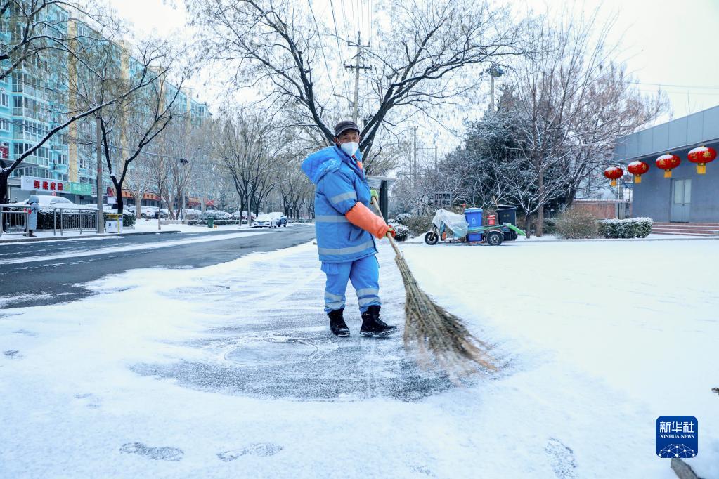 1月23日,北京環衛集團平谷公司道路清掃保潔員在北京市平谷區建設西街掃雪鏟冰。