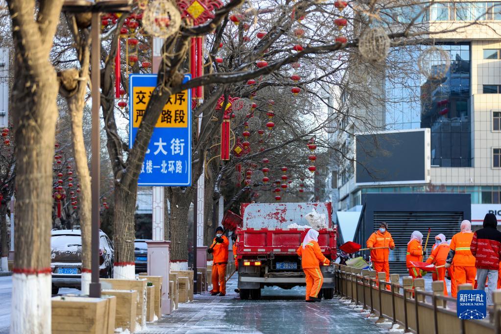 1月23日,在甘肅省酒泉市北大街,環衛工人在清理路面上的積雪。