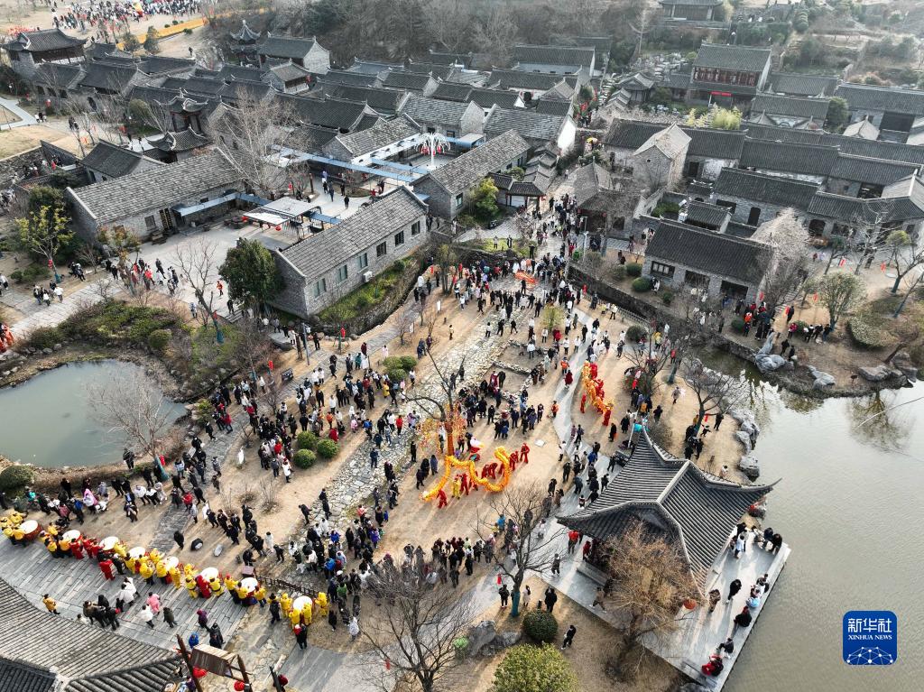 1月23日,市民和游客在盱眙第一山歷史文化街區觀看舞龍表演(無人機照片)。