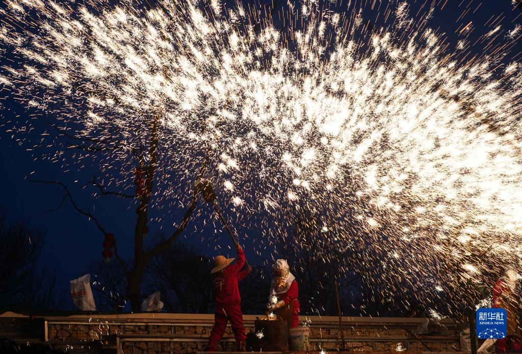 1月23日,民間藝人在盱眙第一山歷史文化街區打鐵花。