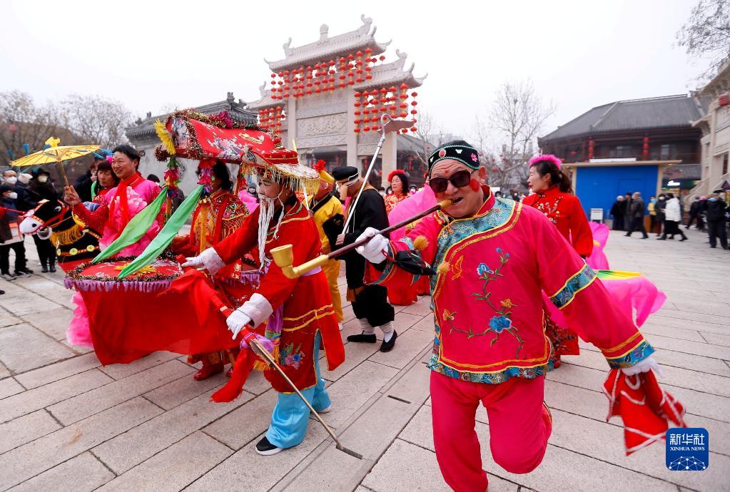 1月23日,民間藝人在山東省青島市即墨古城進行民俗表演。