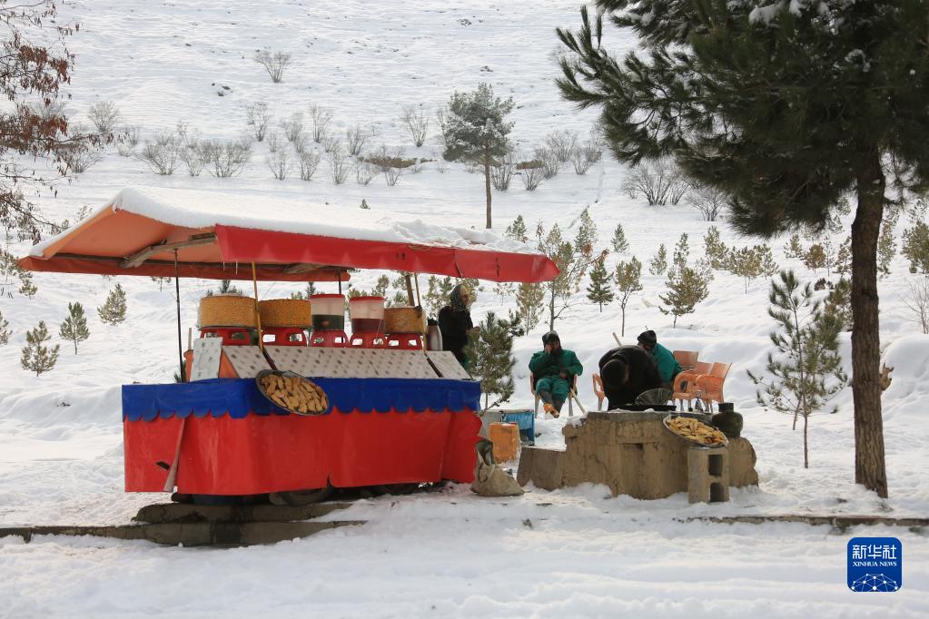 1月23日,在阿富汗首都喀布爾,攤販在積雪的路邊售賣食物。