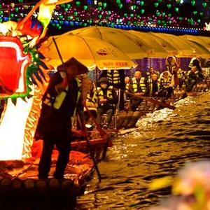 1月23日晚,人們在湖北省宣恩縣城貢水河上體驗“貢水游龍”。