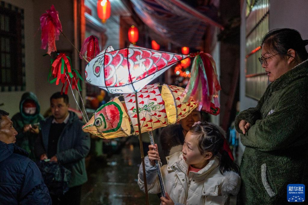 1月23日晚,在安徽歙縣北岸鎮瞻淇古村落,人們嬉魚燈慶新春。
