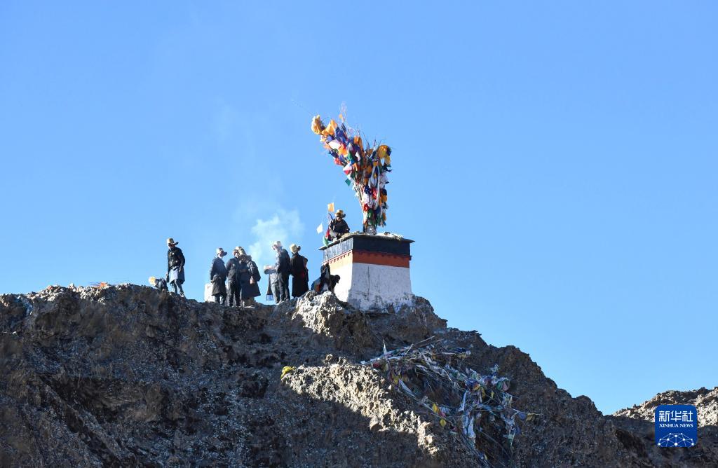 1月23日,西藏拉孜縣曲瑪鄉的藏族群眾在山上豎起五彩經幡。