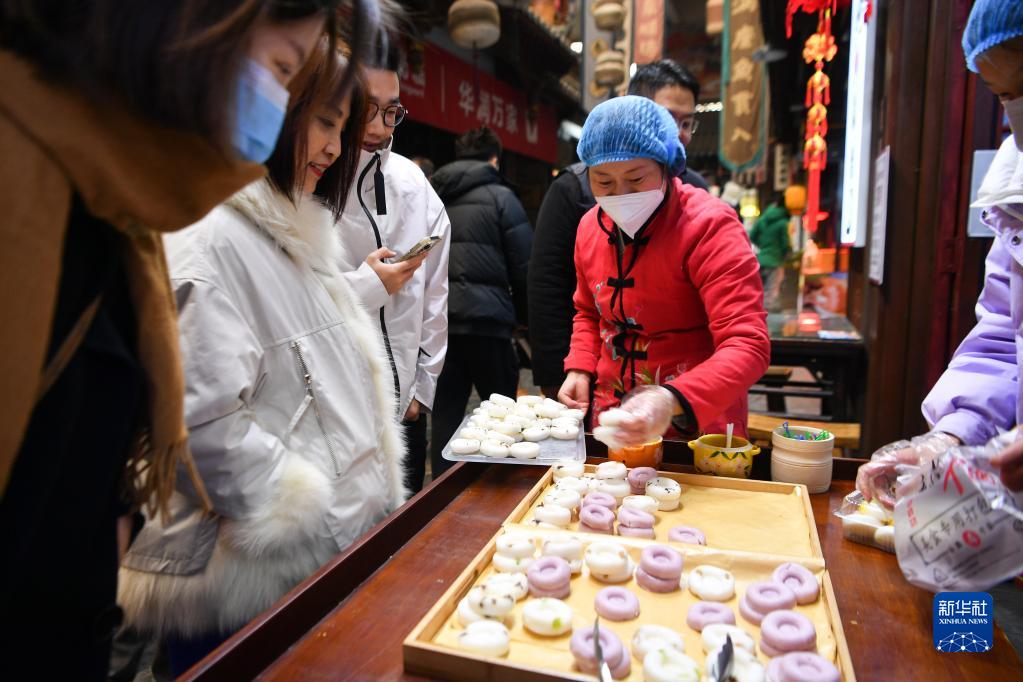 1月24日,在位于陜西省咸陽市的福園巷子街區,顧客選購剛制作好的米糕。