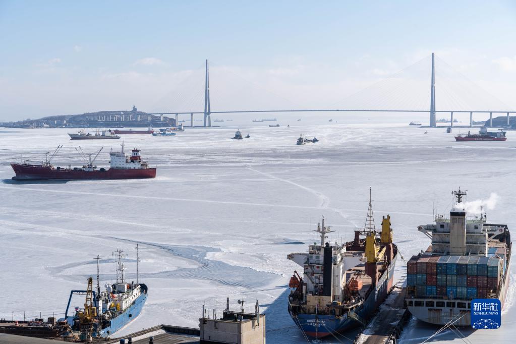 這是1月24日拍攝的俄羅斯符拉迪沃斯托克金角灣冰凍的海面。
