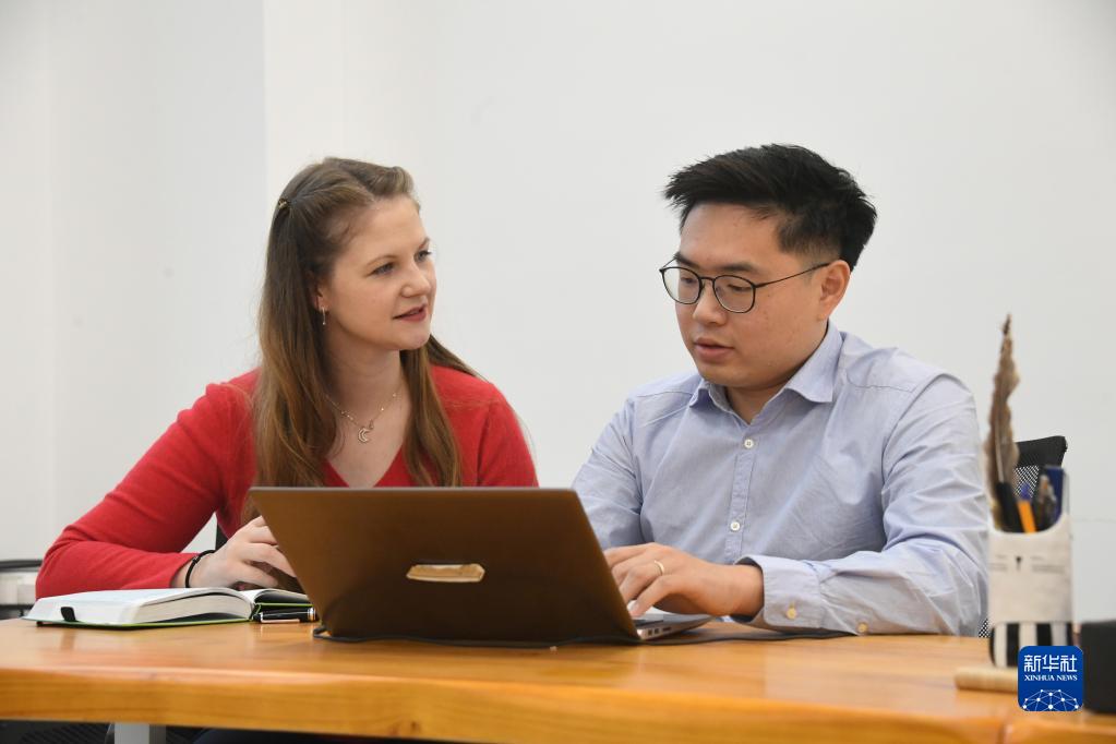 在北京中德產業園,張珍妮(左)與丈夫張鼎然在辦公室交流工作(1月12日攝)。