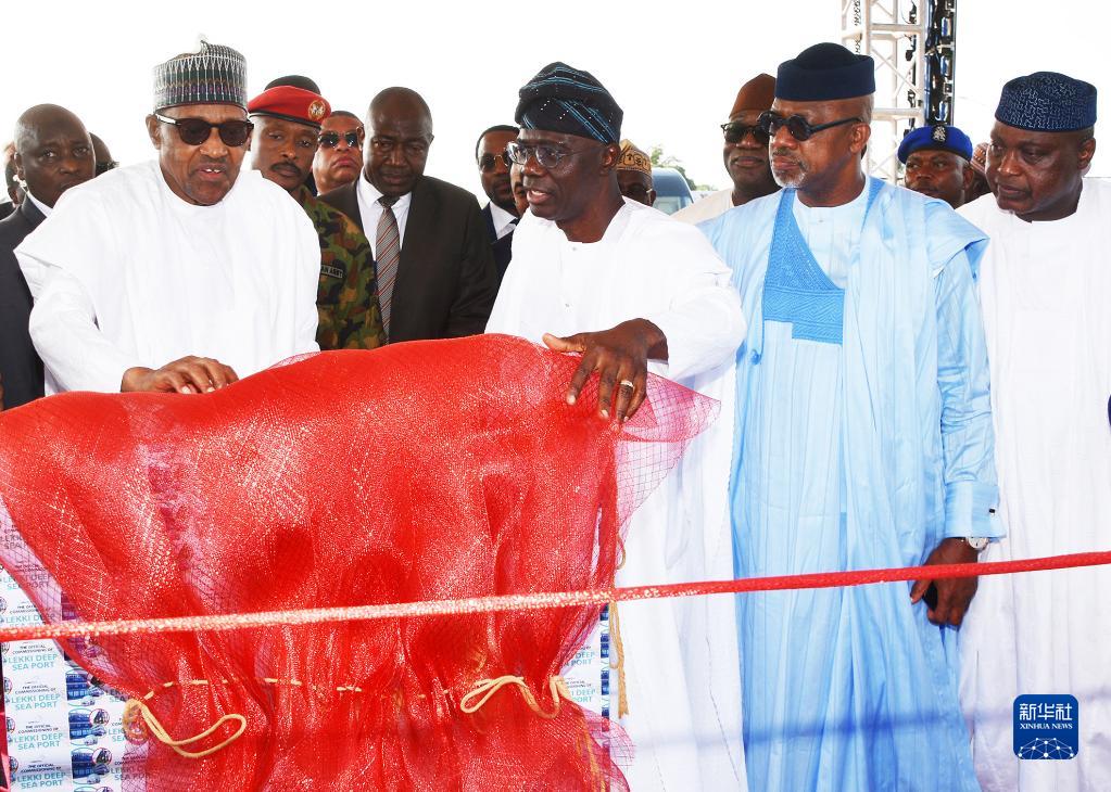 1月23日,在尼日利亞拉各斯,尼日利亞總統布哈里(前左一)出席萊基深水港項目開港運營儀式。