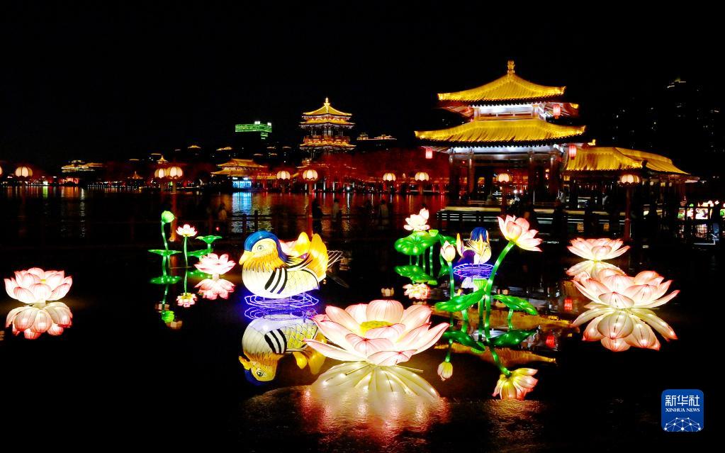 夜幕降臨,西安大唐芙蓉園內萬盞花燈璀璨綻放,在仿唐式園林的亭臺樓閣、廊橋水波之間,燈與景交相輝映,美輪美奐。