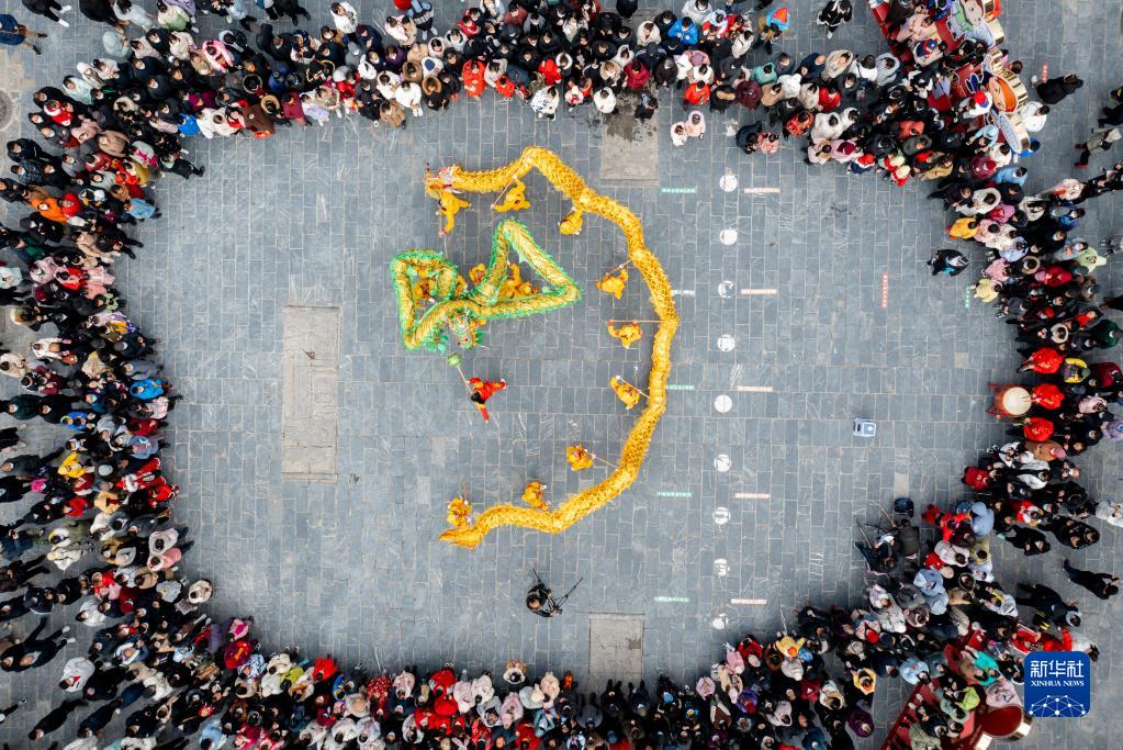 1月24日,民俗表演隊伍在安徽省合肥市肥西縣三河古鎮的“民間文化藝術節”活動上表演舞龍(無人機照片)。
