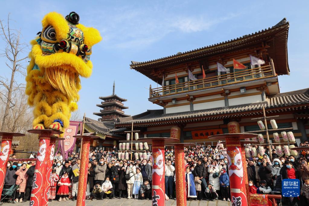 1月25日,游客在湖北省襄陽市唐城春節廟會觀看舞獅表演。