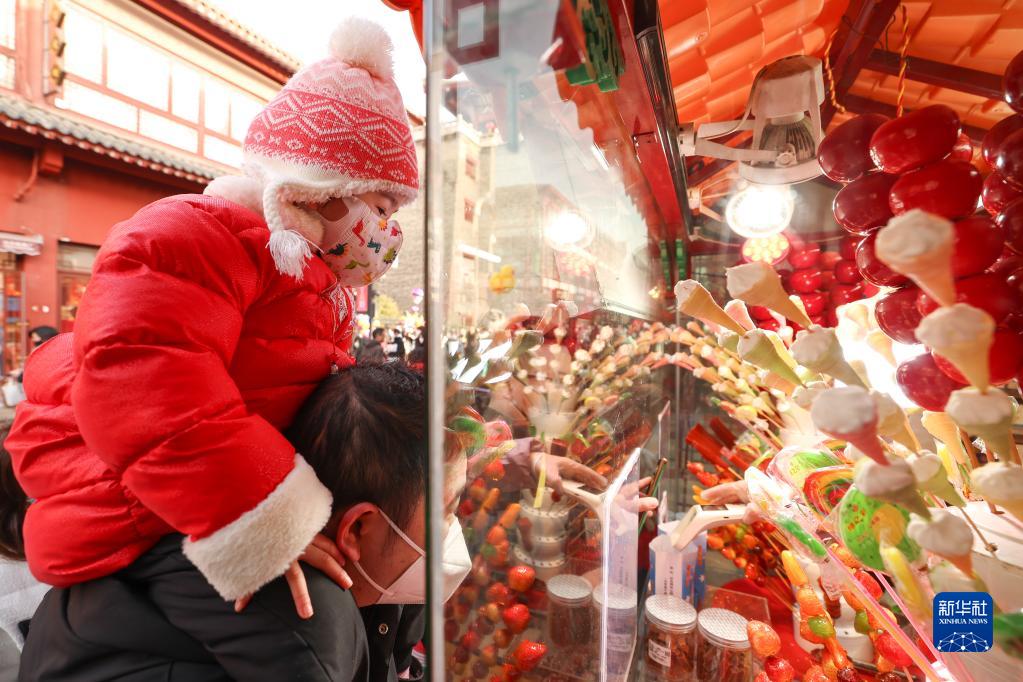 1月24日,家長帶著小朋友在湖北襄陽古城北街選購糖葫蘆。
