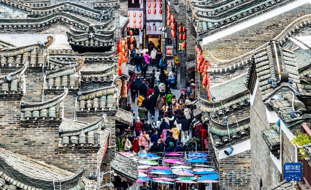 1月25日,游客在廣西桂林市東西巷趕大集(無人機照片)。