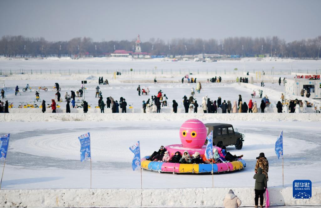 1月22日,游客在哈爾濱松花江冰雪嘉年華園區內體驗冰雪娛樂項目。