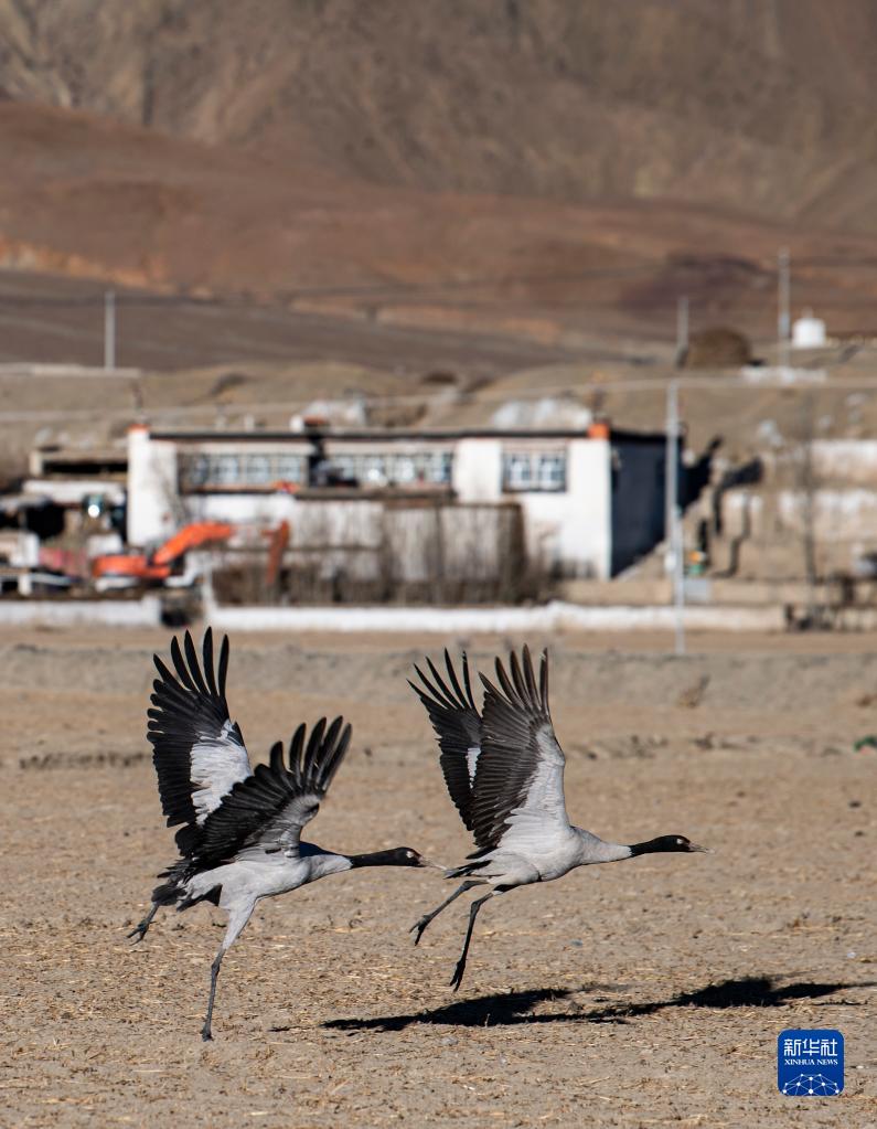 在西藏雅魯藏布江中游河谷黑頸鶴國家級自然保護區日喀則片區拉孜縣附近,大量越冬的黑頸鶴翩翩起舞,迎接春天的到來。