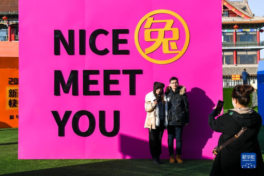 1月25日,市民在內蒙古呼和浩特市玉泉區大召廣場與新春展板合影。