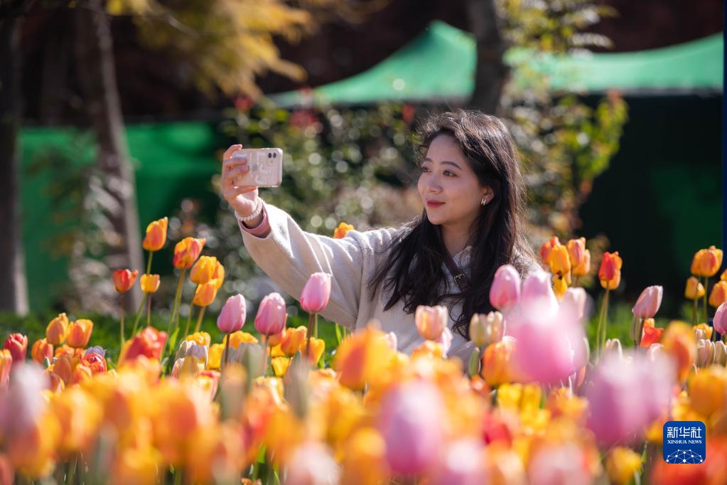 1月25日,游人在昆明撈漁河濕地公園郁金香花展上自拍。