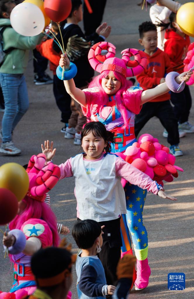 小游客在廣州長隆歡樂世界和演員互動(1月22日攝)。