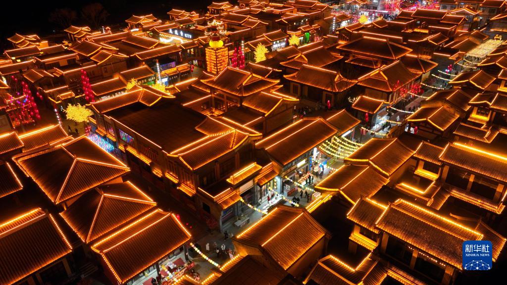 1月25日,游客在山東省臨沂市郯城縣郯國古城觀賞美景(無人機照片)。