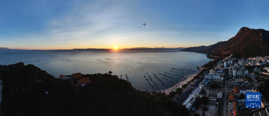 這是1月22日拍攝的云南省玉溪市撫仙湖日出(無人機照片)。