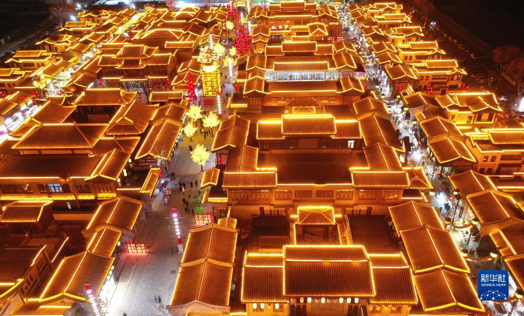 1月25日,游客在山東省臨沂市郯城縣郯國古城景區游玩(無人機照片)。