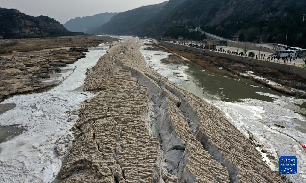 這是1月25日在山西吉縣黃河壺口瀑布拍攝的冰封的十里龍槽(無人機照片)。