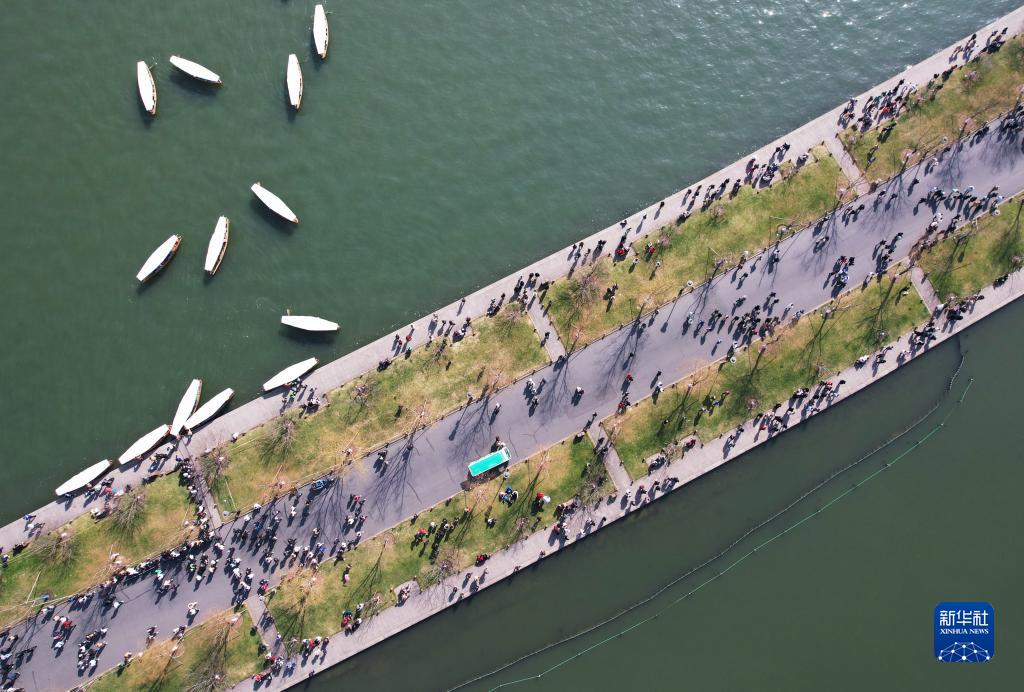 1月25日,游客在杭州西湖白堤上游覽(無人機照片)。