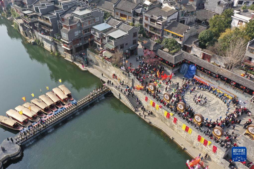 1月24日,在湖南省湘西土家族苗族自治州吉首市乾州古城,民間藝人在進行游春表演(無人機照片)。