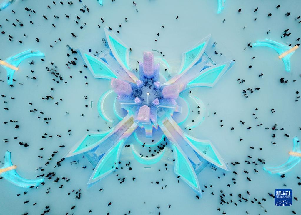 1月25日,游客在哈爾濱冰雪大世界園區內游玩(無人機照片)。