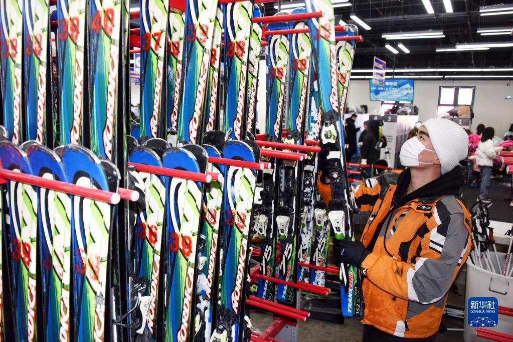 1月25日,青島西海岸新區藏馬山滑雪場工作人員在為游客摘取雪具。