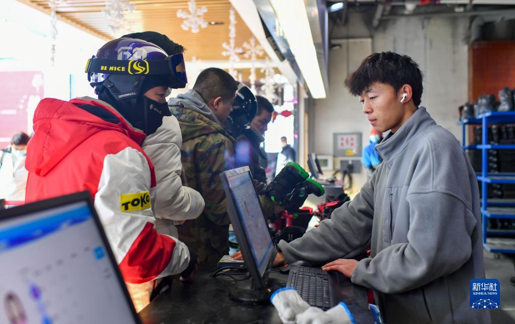 雷嘉?。ㄓ遥┰谛陆z綢之路國際度假區雪具大廳為游客登記雪具租賃信息(1月25日攝)。