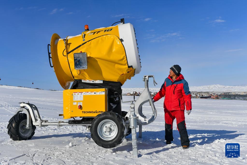 新疆絲綢之路國際度假區工作人員黃文勇在雪場工作(1月25日攝)。他和數十名工友為度假區的幾十臺造雪機提供運維保障。