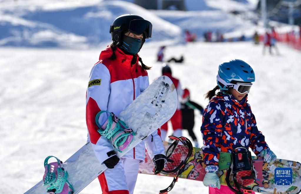新疆絲綢之路國際度假區滑雪教練阿麗米熱·艾海提(左)帶著小學員走進兒童滑雪教學區(1月25日攝)。