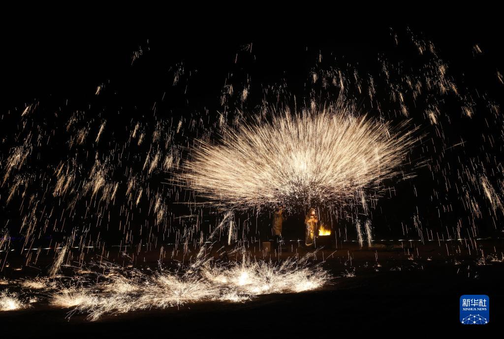 1月25日,民間藝人在河北省石家莊晉州市周家莊鄉第九生產隊為游客表演打鐵花。