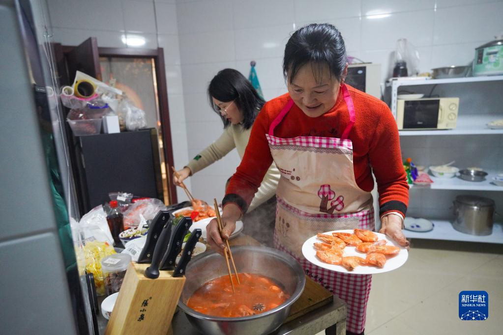 張紅霞(右)在家中的廚房里為雪友準備年夜飯(1月21日攝)。